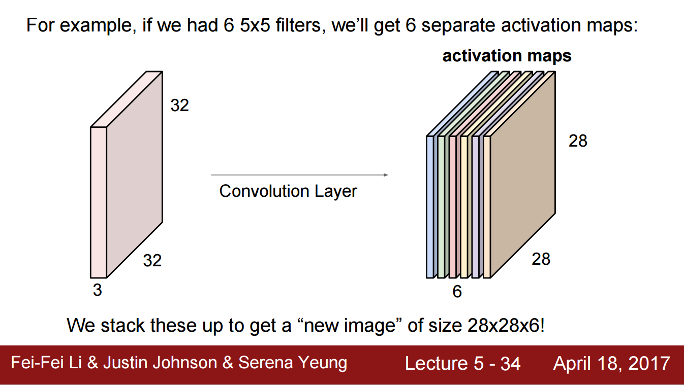 아래 예시에서는 32*32*3 사이즈의 이미지에 5*5*3 사이즈의 필터 6개 적용시켜 6개의 activation map을 얻었습니다.