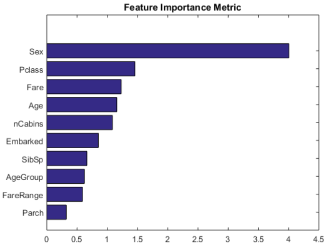 아래 그림은 kaggle의 "타이타닉 생존자 예측 컴피티션"에서 사용된 feature importance 그림인데요,