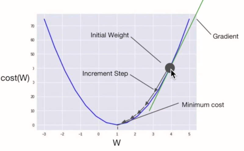 일단 이해하기 쉽게 b=0이고, w의 변화에 따른 cost 값의 변화를 그린 그래프를 참고하면서 설명해볼게.