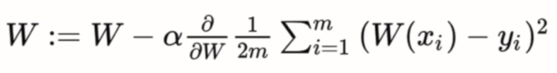 learning rate 값(α 값, 학습률)을 지정해주면서 학습을 얼마나 할지 우리가 결정하고, 그 값과 기울기를 곱한 값만큼 w에서 빼주면 돼. 식으로 나타내보자